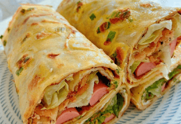 步骤六:将鸡蛋饼铺开,刷上提前准备好的”腐乳汁“”辣椒油“”葱花碎“然后在放入油条一根,两根切好的火腿肠,两把土豆丝,然后用对折的方式将饼卷起来,这样就完成了。