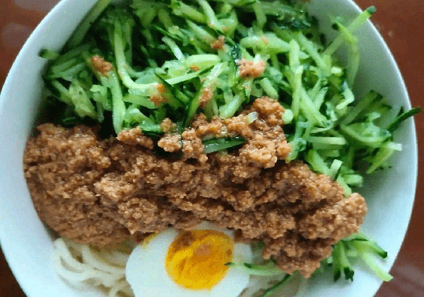 步骤二:锅中烧热水烧开之后,下入提前准备好的切面煮熟,捞出过凉备用。鸡蛋下入锅中煮熟,黄瓜洗净用擦板擦成丝。