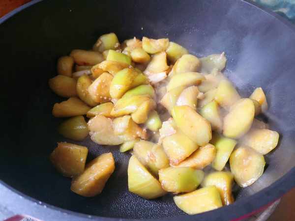最后,茄子炒出来汁水了,我们将刚才准备好的扇贝肉放进去。