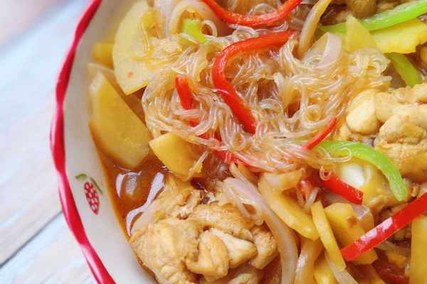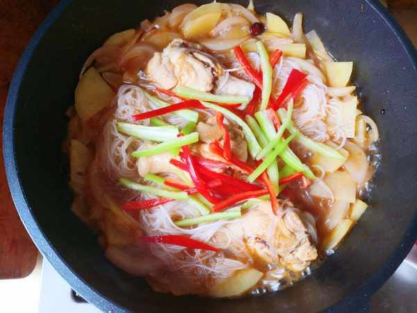 等锅中的鸡腿散发出香味之后,我们放入泡好的粉丝和青红辣椒,青红辣椒的作用是能够很好的提升菜品的香味。