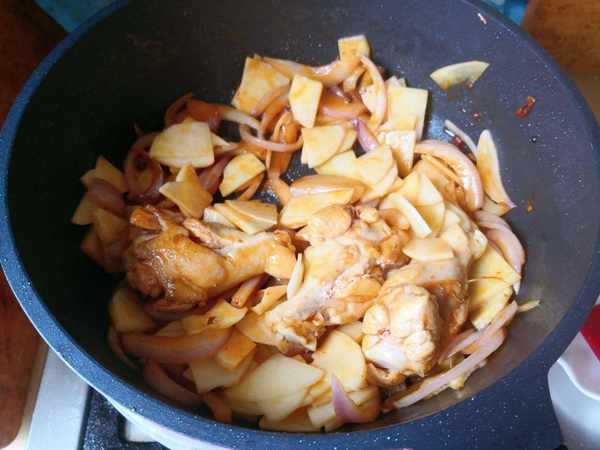 起锅烧油放入刚才准备好的调料,爆香之后,放入整个的鸡腿,开大火炒出来汁水。