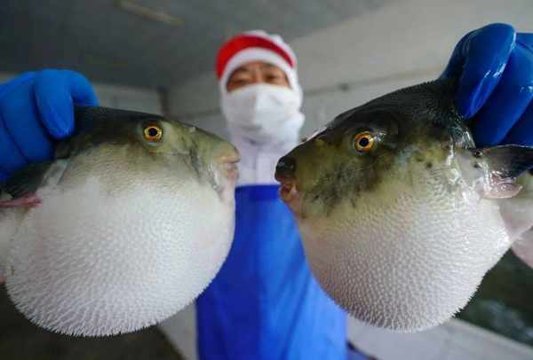 2020年10月24日,河北省唐山市曹妃甸区一家河豚鱼深加工企业的工人展示河豚鱼。新华社记者 杨世尧 摄