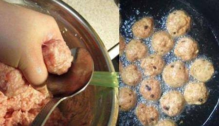 6、戴一双一次性手套,左手抓捏适当量的肉糜,从虎口处挤出肉馅成丸状。右手拿着勺子,勺子要事先沾点水,把肉丸舀出。