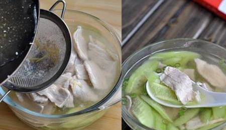 黄瓜肉片汤。