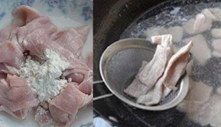 2、先将从早市买回的新鲜的里脊肉冲洗掉上面的污血,再用手切成薄片状。往里加入适当的淀粉,用手进行均匀地抓捏。