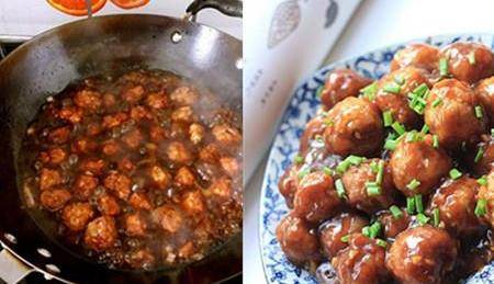 9、将适当量的植物油加入锅中,紧接着把准备好的葱末和生姜末倒入其中,小火煸炒出香味。这时候再把事先调制好的料汁倒入锅中,再往里加入适当量的清水。大火煮至锅中的汤汁滚开后,把调制好的水淀粉进行勾芡。紧接着再把之前炸好的肉丸下入炒锅,中火煮至汤汁变得浓稠后便可出锅食用了。