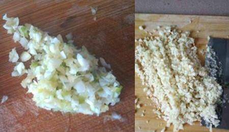 3、大葱用剪子剪掉须部,放在清水里清洗干净。把其中的葱白用手切成碎末状,装在盘子中备用。把生姜去掉外皮,用刀切成小丁状。