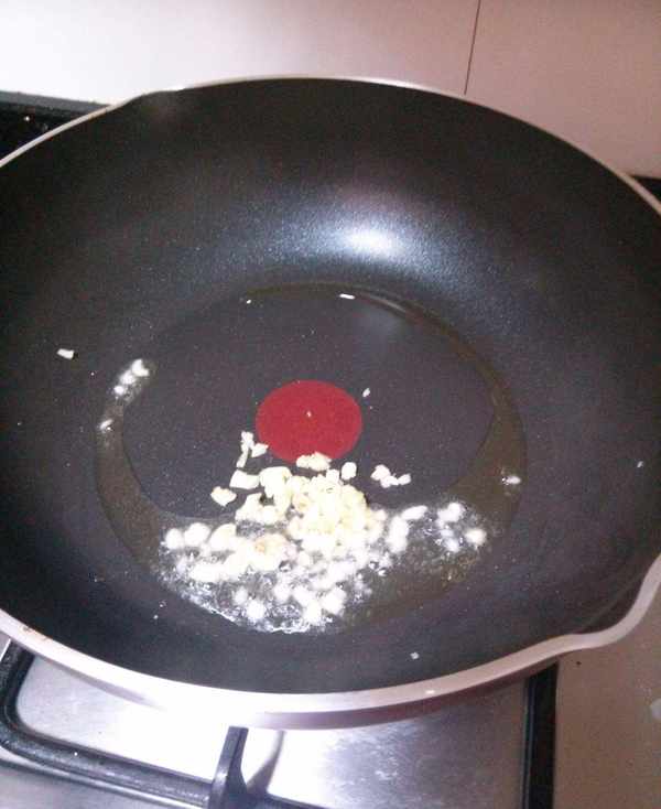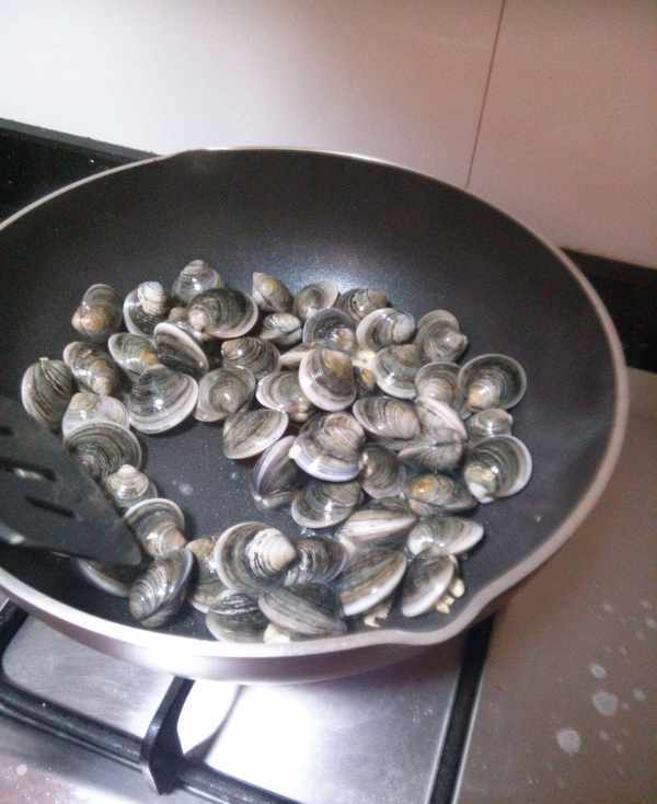 2热锅下油,先爆香大蒜,然后下蛤蜊爆炒。