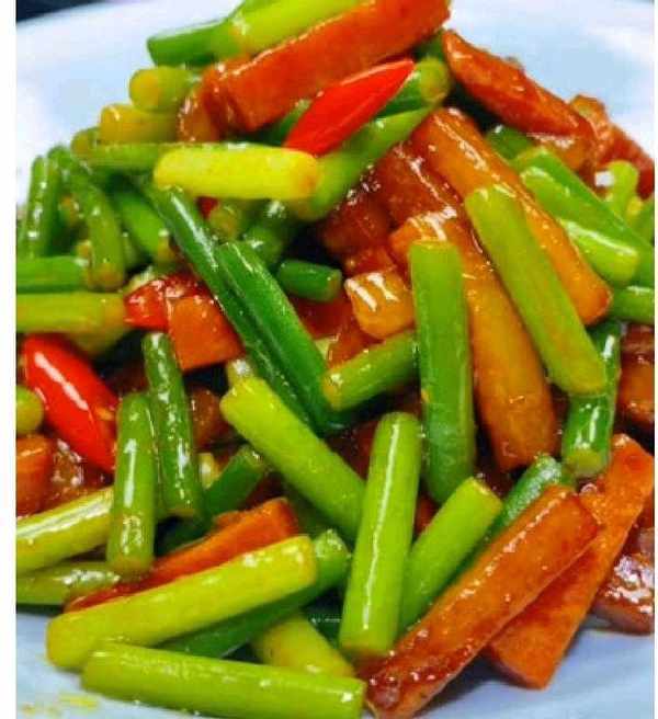 下入泰椒和火腿条,接着放入一小勺花椒面,一勺生抽,一勺耗油,放入焯好水的蒜臺,然后淋入适量的水淀粉勾芡,大火翻炒即可出锅。