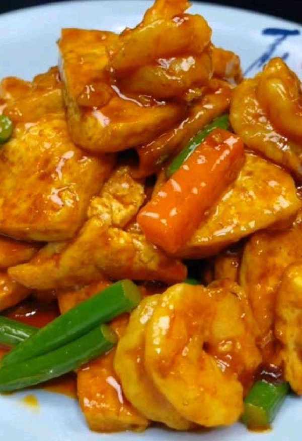 加入一大碗清水,开锅以后二十秒捞出虾头,虾头不要了,下入虾仁和煎好的豆腐。
