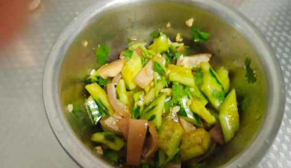 3、准备一个拌菜盆,把切好的猪皮和黄瓜放进去,然后依次放入,盐生抽香醋白糖鸡精香油料油蒜末和香菜颠盆搅拌均匀就可以装盘了