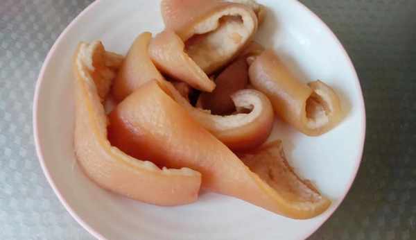 1、把猪皮洗净,冷水下锅,放葱姜料酒,花椒焯水后过凉备用