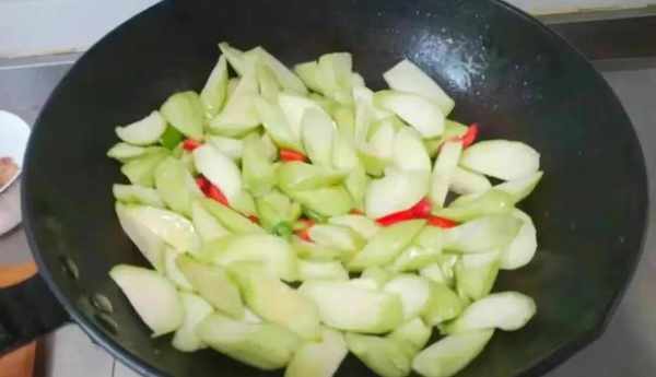 1、把丝瓜去皮切滚刀块,红椒切菱形块备用