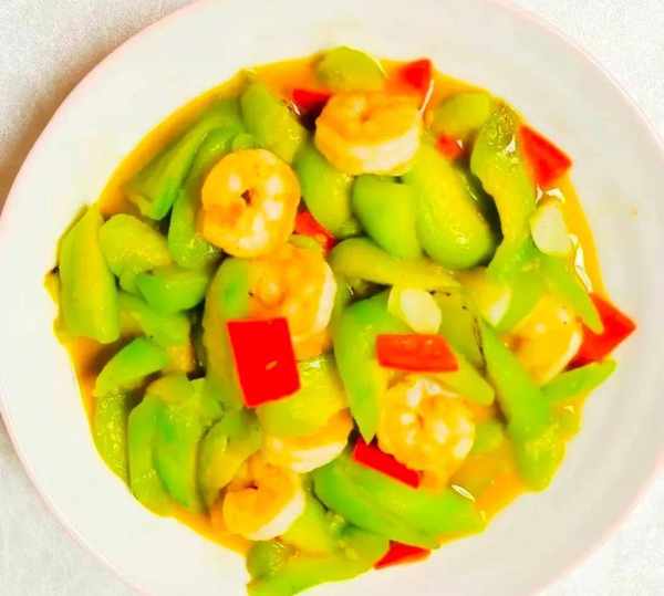 4、再次起锅烧油放蒜片,爆香倒入红椒和丝瓜大火爆炒60秒,加盐生抽少许清水倒入煎好的虾仁再继续爆炒六十秒即可出锅装盘