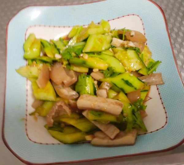 食材:黄瓜,猪皮,蒜末,香菜,食用盐,生抽,香醋,白糖,鸡精,香油,料油,葱姜,料酒,花椒