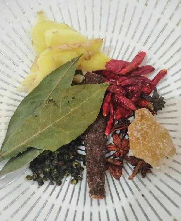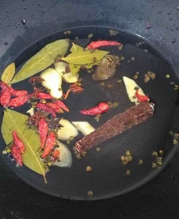 4.调料:冰糖、姜片、桂皮、八角、香味、干辣椒、花椒洗净备用,辣椒根据自己口味放