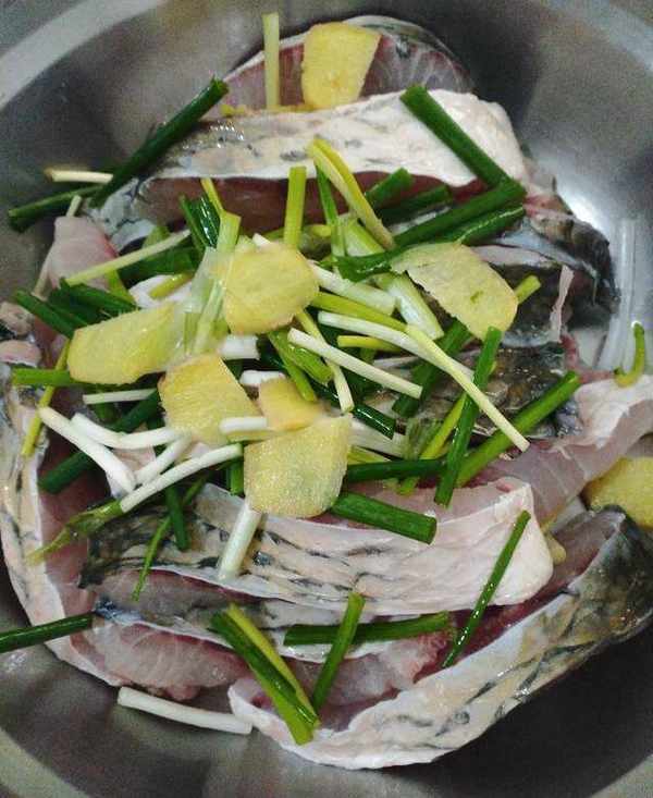 3.鱼块放入盆中,加料酒、葱段、姜片腌制3小时,也可放冰箱腌制隔夜再炸,味道更佳