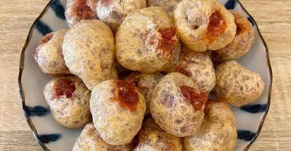 由于购买面筋会有差异,所以在填充的时候要根据时间情况填入。