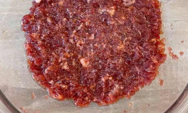 1️⃣ 绞肉请摊贩绞两遍、蛋打散、葱切长段、姜切片、将葱段与姜片加水淹过,接著用手将葱姜抓烂并挤出汁水成葱水备用。