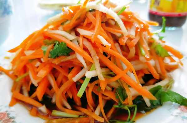 【食材和配料】:白萝卜,胡萝卜,香菜,白糖,味极鲜,醋,盐,香油。