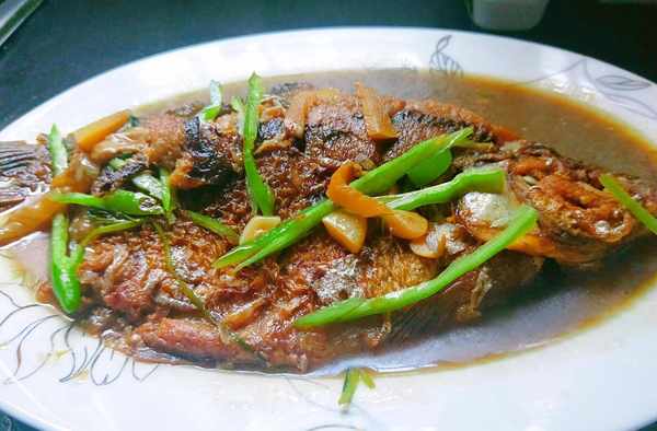 3,起锅烧油,油热后,放入少许盐和少许生姜,晃动锅,使油布满锅底,放入白鱼,煎至一面金黄,翻面也煎至金黄,放入切好的姜、蒜和小香葱结,倒入适量的料酒、酱油、盐、少许白糖、少许醋,煎几秒钟,加入适量的清水(水量没过鱼身),大火烧开,改中火慢炖,中途翻两次,炖至汤汁浓稠,倒入适量的味极鲜,把鱼盛入盘中,撒上青椒丝,倒入汤汁,即可食用。