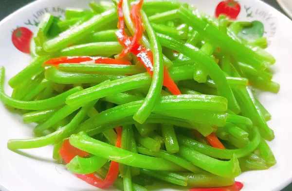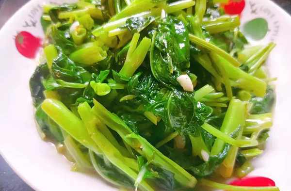 炒空心菜,动作一定要快,否则空心菜炒出来会发黄。