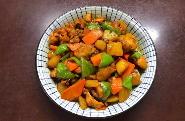 5、大火煮开后转中小火,焖煮至鸡腿肉和土豆都酥烂,加入胡萝卜和青椒煮至汤汁浓稠加少许糖调味后就可以关火了。