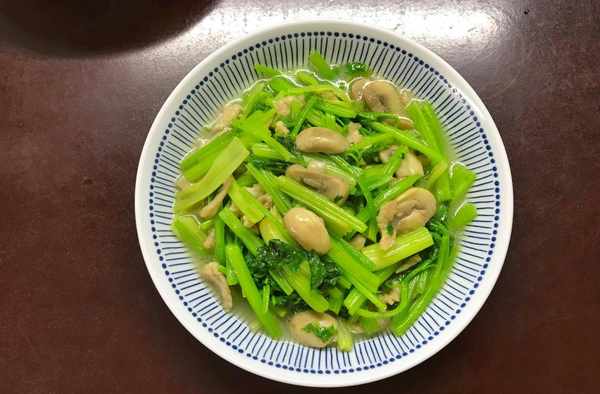 【材料】:芹菜500克,猪肉1小块,蘑菇8个,盐少许,油适量