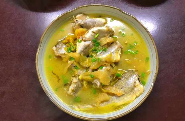 小黄鱼除了香酥炸制外做得最多的一种做法,配上酸菜,鲜美入味,特别下饭,用来下面条也绝赞的。