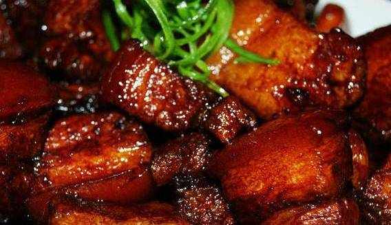 将五花肉切成麻将大小的块,冲洗干净后放入料酒浸泡一小时,捞出来沥干;锅中添油,6成热时加入腌制好的肉块煸炒到微黄;放入八角、姜等作料炒出香味;放入料酒,再放入老抽,生抽,炒匀;放入开水,淹没肉即可,小火慢炖两小时加入盐调味;放入冰糖收汁,不要翻动,以防打乱肉的结构;汤汁均匀裹在肉上,出锅。
