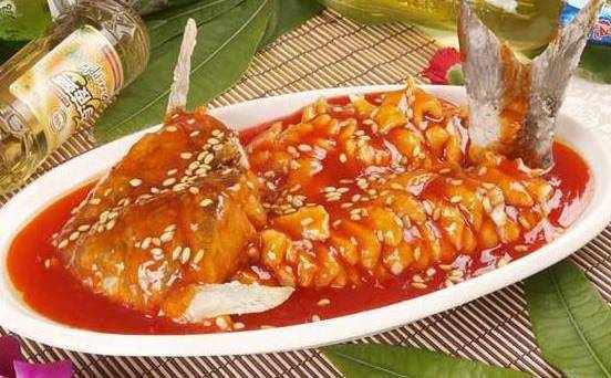 到这里,一道酸酸甜甜的糖醋鱼就完成了,这是最简单的做法,不需要太麻烦的配料和准备时间,炸鱼剩下的油在放凉之后可以重复使用,其中有几点是需要注意一下:改刀时,第一刀鱼头方向斜切至骨,然后在贴着骨头往鱼头方向切一下,每刀都一样,这是方便最后淋汁入味;炸鱼的时候,油温过高,手可以拿着鱼鳍略微定型后放入,注意不要烫手;鱼炸之前用盐抹一下,更利于入味。