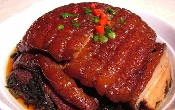 梅菜扣肉这道菜属于客家菜系,客家人将五花肉加入配料进行制作,再将肉垫在梅菜干上蒸煮,制作了一道色泽油润、香气浓郁的美味佳肴,逐渐演化为我们时常吃的梅菜扣肉了。成菜后,肉烂味香,吃起来咸中略带甜味,肥而不腻。