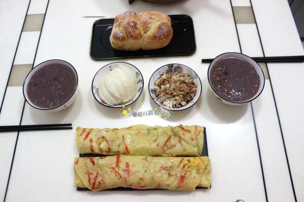 麵包提前烤好,早上直接上桌就好,雞蛋餅很簡單10分鐘不到就可以烙好,黑米粥預約的,簡單吧~