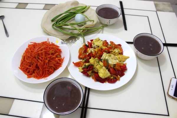 六:蒸薄餅+甜椒炒蛋+雜糧粥+清炒胡蘿蔔絲
