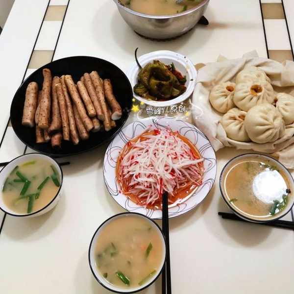 七:肉包子+蒸山藥+鮮蝦疙瘩湯+清拌小蘿蔔