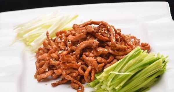 主料选用里脊肉、细香葱、豆腐皮,辅料用甜面酱、生抽、盐。