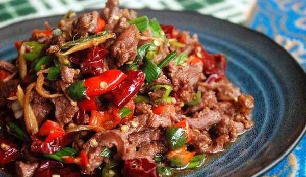 3、热锅放油,烧至七成热,放入葱姜蒜和干红辣椒爆香,然后放入花椒和麻椒,转大火,倒入腌好的牛肉,不停的翻炒,稍微变色加几滴白酒,伴着酒香一直翻炒,炒大约两三分钟就可以了,最后加入盐,生抽调味,翻炒均匀,出锅。