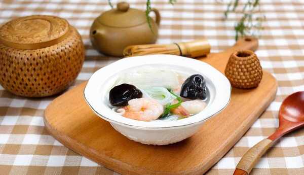 2.锅置旺火,下化猪油烧至六成热时,放冬瓜片微炒,掺入鲜汤,煮至冬瓜片已熟时,放入香菇片、冬笋片继续煮至冬瓜软嫩,再加胡椒粉、精盐、味精调味,装入汤碗内即成。