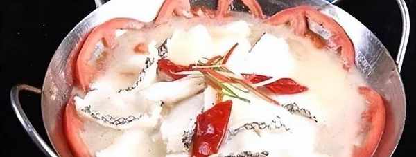2、炒锅下油烧至3-4成热将鳕鱼浸泡5成熟捞出待用,净锅下油烧将西红柿煸香,下小料头、鸡汤、花菜、竹笙、用辣椒仔、盐、味精、白糖、白醋等调味装入锅仔、上面放鳕鱼片即可。