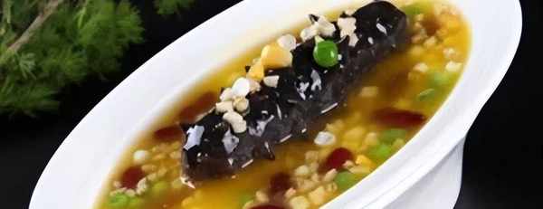 2、净锅下水将青豆、燕麦、玉米、红豆、薏米加二汤、盐、味精、鸡粉煨制3-5分钟捞出装入盘中,上面放入煨好辽参待用。