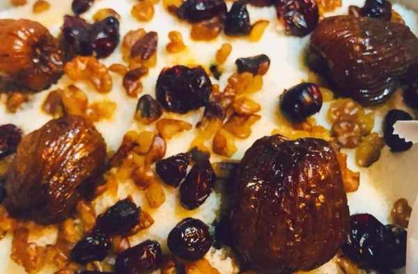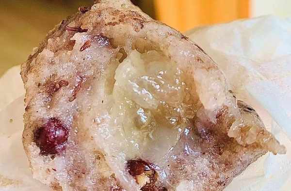 松糕里满是红豆沙,现代人们还喜欢撒上蜜枣、蔓越莓干、核桃仁等。一口咬下去,香甜软糯,甜度不高。