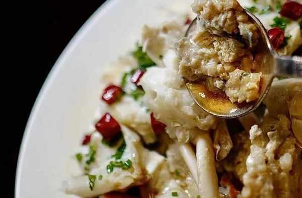 以青鱼下巴和甩水为主料,鱼肉洁白鲜嫩,吃起来糯滑醇美,尾鳍上有丰富胶质,吃起来极鲜。