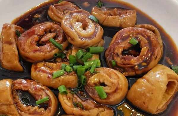 这红烧圈子色泽红亮,卤汁浓稠,尝起来香鲜软糯,咸中带点甜,常与生煸草头搭配,又成了另一道“草头圈子”,这一荤一素的搭配,一个清爽,一个油腻,相得益彰。