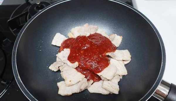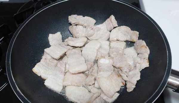 4.首次煎过的五花肉最好用吸油纸,把油吸过后装盘备用。然后再把五花肉和酱料倒入锅内,进行大火煎炒。注意不要煎糊了。