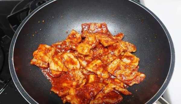 5.煎炒时多翻面,做到不糊。炒至五花肉均匀吸收酱料为止。