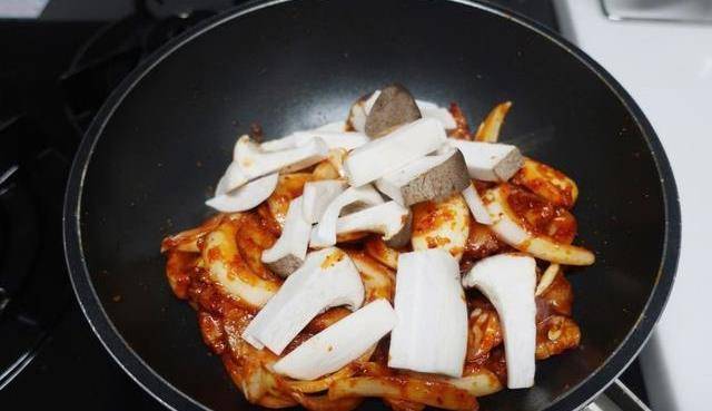 6.放入香菇和洋葱,继续翻炒。