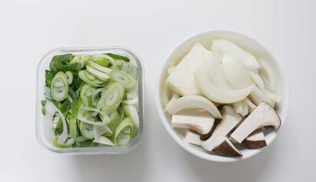 1.首先洋葱和香菇,切成均匀的厚度备用,大葱也要切成葱花备用。