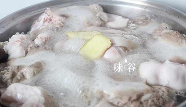 2、猪蹄洗净斩块,锅内烧水放入姜片,料酒,煮出血沫,捞起来。