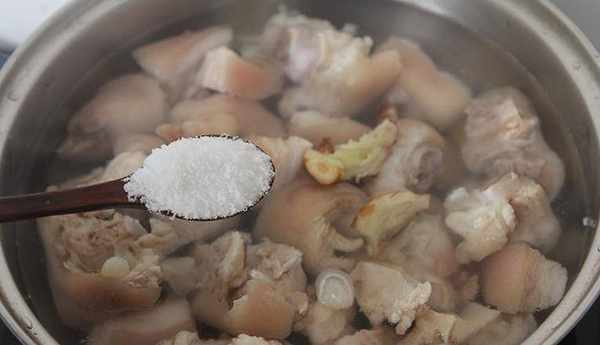 3、重新装一锅水,放入猪蹄,姜片,葱,盐,拍一块沙姜放下去一起煮半个小时左右,喜欢吃软点的就煮久点,煮好后捞起。煮猪蹄的汤留下两碗备用