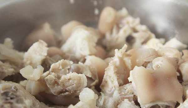 4、煮好的猪蹄用凉开水冲洗一下,放凉备用,(如果有冰块更好,凉开水放入冰块 浸泡一下猪蹄这样口感更好)
